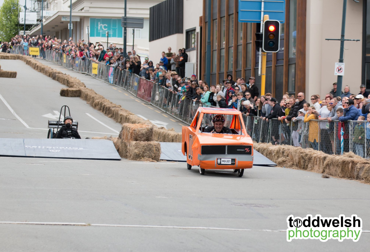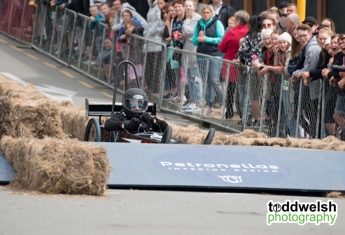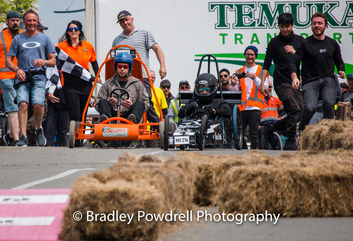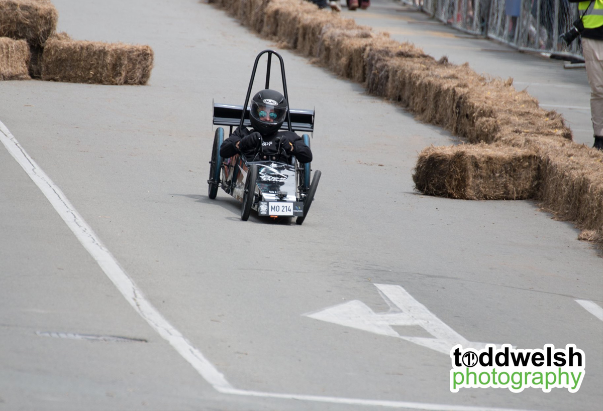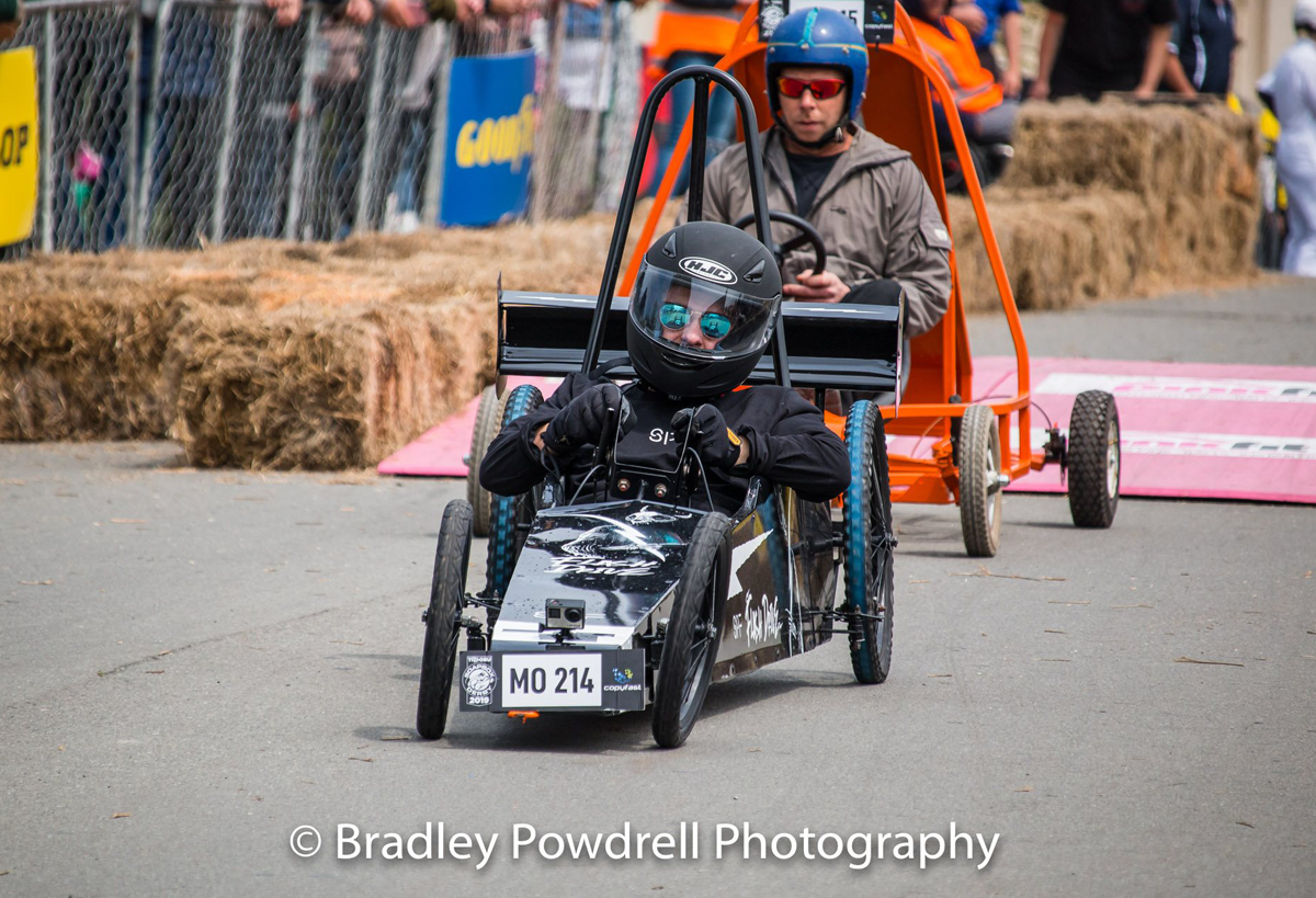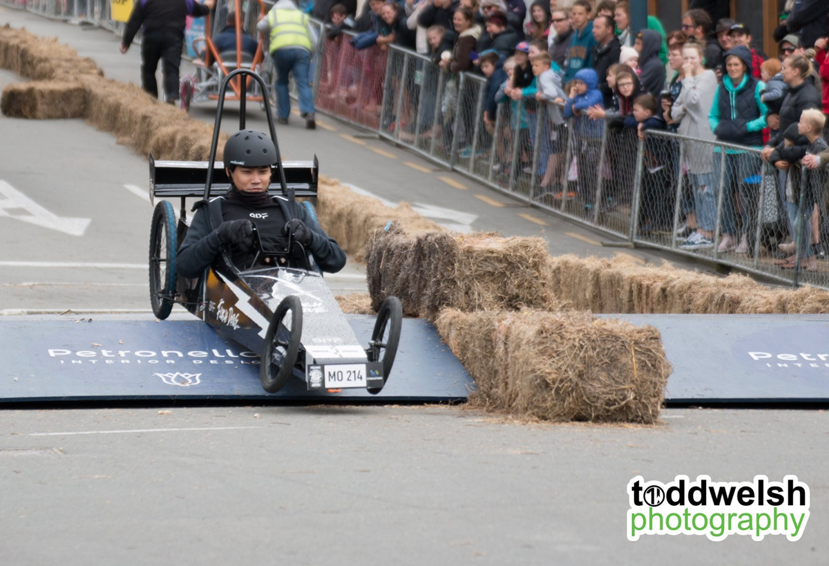 With our lighting fast cart "Flash Drive" we were looking forward to the day of racing, unfortrunately the Friday before the race, DISASTER! Our steering mechanism completely sheered from the body of the cart during a test run! Thanks to some Kiwi inginuity and good friends we managed to get the cart repaired in the nick of time and lined up on the start line on Race Day with 50 other amazing competitors and carts. Everything was going well during our first run, we had a great push off the line and Kai Mao shot off down the course like a bullet from a gun! He steered the cart expertly over the jumps and was destined for victory untill... 1 foot from the line the front wheel collapsed and in true tortoise and the hare fashion we were overtaken on the finish line! We had 2 more runs throughout the day but Flash Drive was never the same and crashed on both the following runs to great amusement of the crowd! At least we were entertaining, giving the people what they wanted! We are proud of all our team for giving their all on the day and getting the cart ready in the build up to the event.