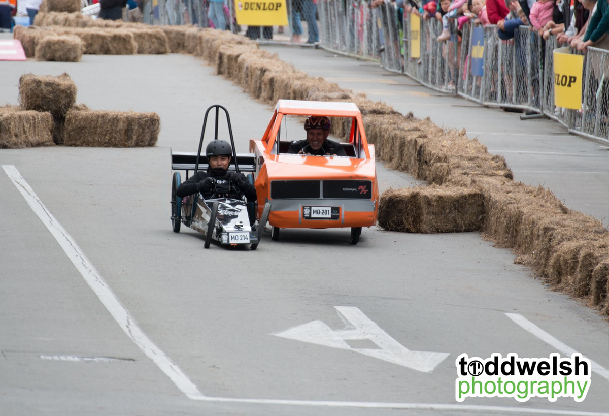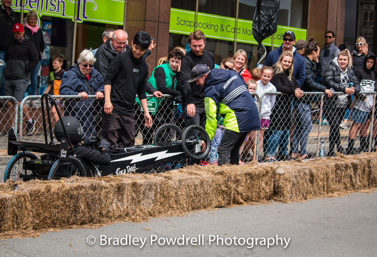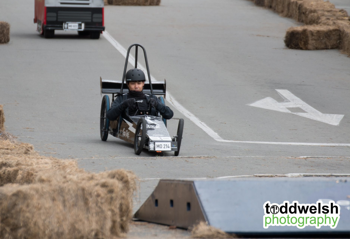 With our lighting fast cart "Flash Drive" we were looking forward to the day of racing, unfortrunately the Friday before the race, DISASTER! Our steering mechanism completely sheered from the body of the cart during a test run! Thanks to some Kiwi inginuity and good friends we managed to get the cart repaired in the nick of time and lined up on the start line on Race Day with 50 other amazing competitors and carts. Everything was going well during our first run, we had a great push off the line and Kai Mao shot off down the course like a bullet from a gun! He steered the cart expertly over the jumps and was destined for victory untill... 1 foot from the line the front wheel collapsed and in true tortoise and the hare fashion we were overtaken on the finish line! We had 2 more runs throughout the day but Flash Drive was never the same and crashed on both the following runs to great amusement of the crowd! At least we were entertaining, giving the people what they wanted! We are proud of all our team for giving their all on the day and getting the cart ready in the build up to the event.